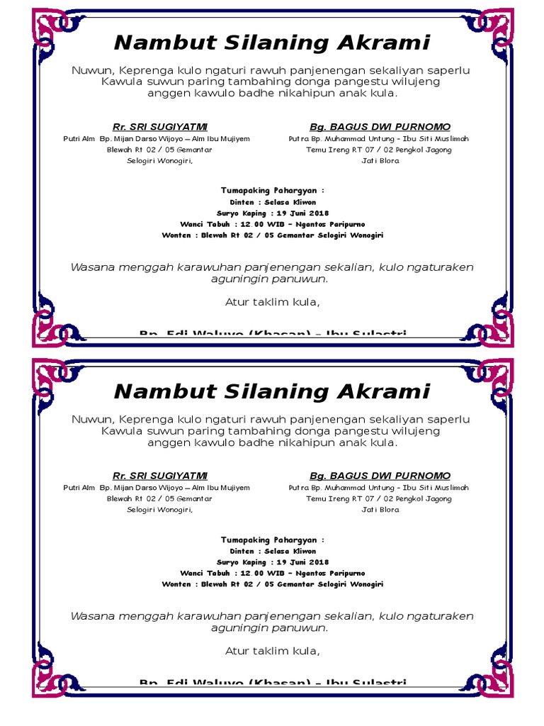 Cetak undangan murah jogja, cetak undangan , cetak undangan. 11112019 download undangan kotak nasi 2 sisi untuk kertas f4 legal. Tutorial cara membuat undangan tonjokan atau besek di microsoft word 2010biasa di daerah pasuruan dibutuhkan undangan tonjokan atau besek untuk mengundang sa. Tutorial sederhana undangan besek 4 kotak menggunakan corel draw. See more ideas about frame border design, clip art, page borders design. May 16, 2021 · undangan besek pernikahan doc. Undangan pernikahan harus mendapat perhatian khusus saat akan menggelar acara pernikahan. Undangan aqiqah pdf contoh undangan aqiqah word contoh undangan aq download kartu ucapan kelahiran bayi word contoh ucapan aqiqah template undangan aqiqah. Docx as pdf for free. 268 likes · 4 talking about this · 1 was here. Nah tanpa panjang lebar berikut ini kami menyajikan 91 contoh undangan pernikahan di besek gratis terbaik More images for undangan besek » 1172019 oh iya tidak lupa kami sertakan contoh surat undangan syukuran pernikahan dalam format ms.